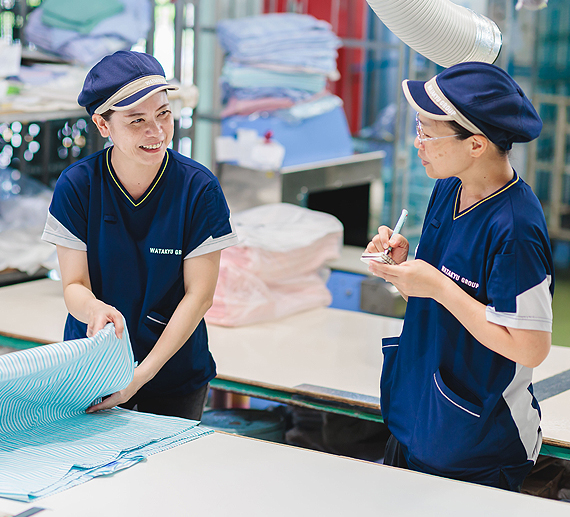配属されたのは、病院に納品するシーツや病衣を仕上げる部門。初めての工場勤務に右も左もわからない中、先輩たちに優しく教えていただきながら、できることを徐々に増やしていきました。スピードと品質を両立させなければならない緊張感があるものの、誰かがミスしても責めることなく瞬時に手分けしてカバーし合うチームワークが心強かったです。周りに助けてもらったことへの感謝の気持ちから、自然とチームの一員としてみんなの役に立ちたいという意識を持つようになりました。